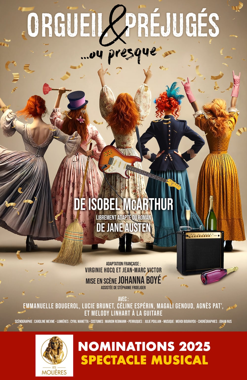 Accompagnées d’une musicienne, cinq comé-diennes racontent avec humour les péripéties des sœurs Bennet et de leur mère, prête à tout pour les marier. La folie, la fantaisie et l’humour d’Isobel McArthur ont infusé les situations et les person-nages pour donner un texte décapant et féroce-ment drôle.